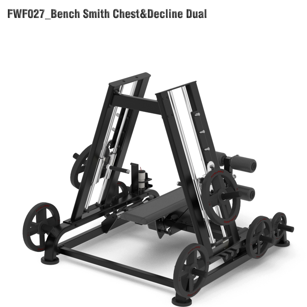 Tailored for commercial gyms and performance facilities, the FWF‑027 Bench Smith Chest & Decline Dual integrates a dual-system guided bar with an adjustable bench, offering both chest press and decline press functions. This design allows users to target both upper and lower pectoral muscles safely and effectively. The machine features a 10‑position horizontal track, 5-step adjustable backrest angles, and a heavy-duty welded steel frame for long-term durability and stability.